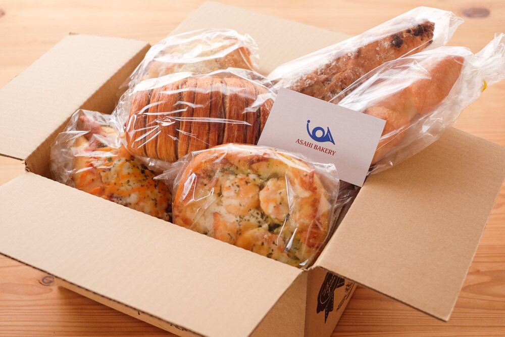 塩パンやロールパンなどの小さなお食事パン・惣菜パン・菓子パン合わせて9個〜11個(2,900円相当以上)をその日のうちに急速冷凍し、60サイズの箱にお詰めして全国へ発送いたします。